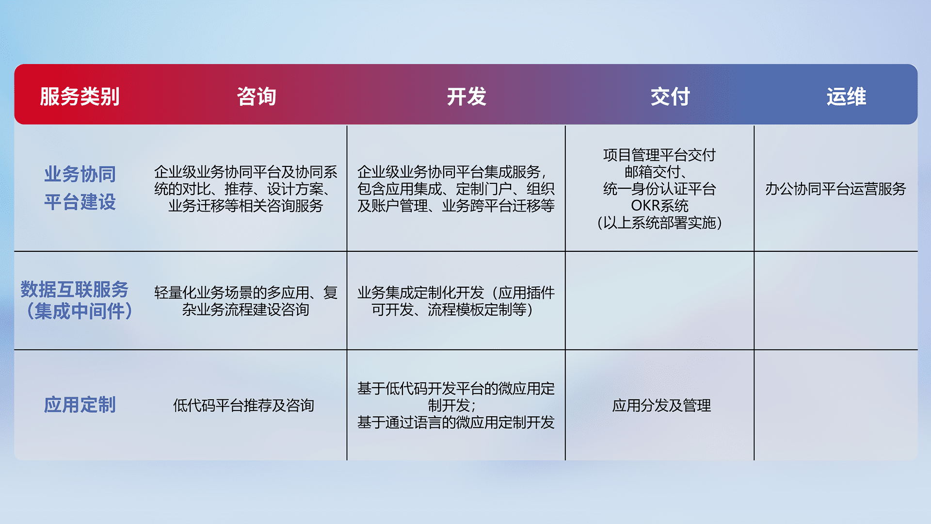 针对钉钉、、、企微、、、IDaas等平台级产品提供产品的规划、、、、方案、、、交付、、、定制化开发等服务,,,,实现如统一协同办公、、、智能客户服务、、、混合会议管理、、智能数据查询、、、等业务场景,,实现数字化转型。。。。