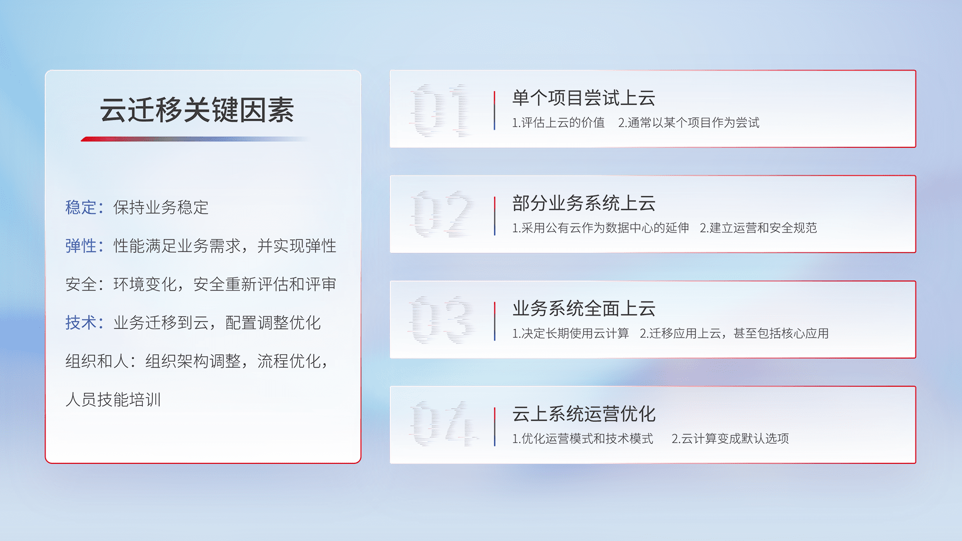 结合实际业务,,从规划设计、、、云平台选型、、云原生改造、、、、数据迁移、、、、集成交付,,,,迁移全过程为客户识别最佳上云路径,,做好风险识别管理,,,设计网络架构、、身份权限、、、、安全审计合规、、操作审计、、日志审计、、、监控告警策略、、多站点容灾设计等,,,对云上基础设施进行整体规划,,,,提升IT治理水平,,,以满足弹性、、、、高可用、、、高性能的需求。。。。