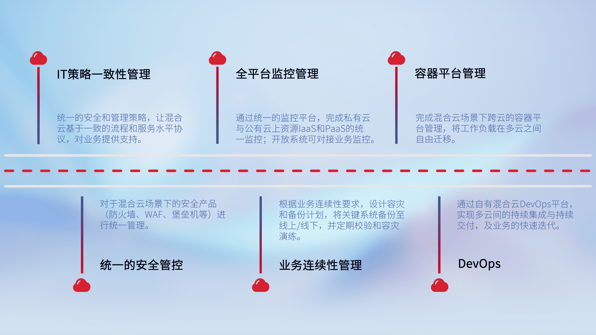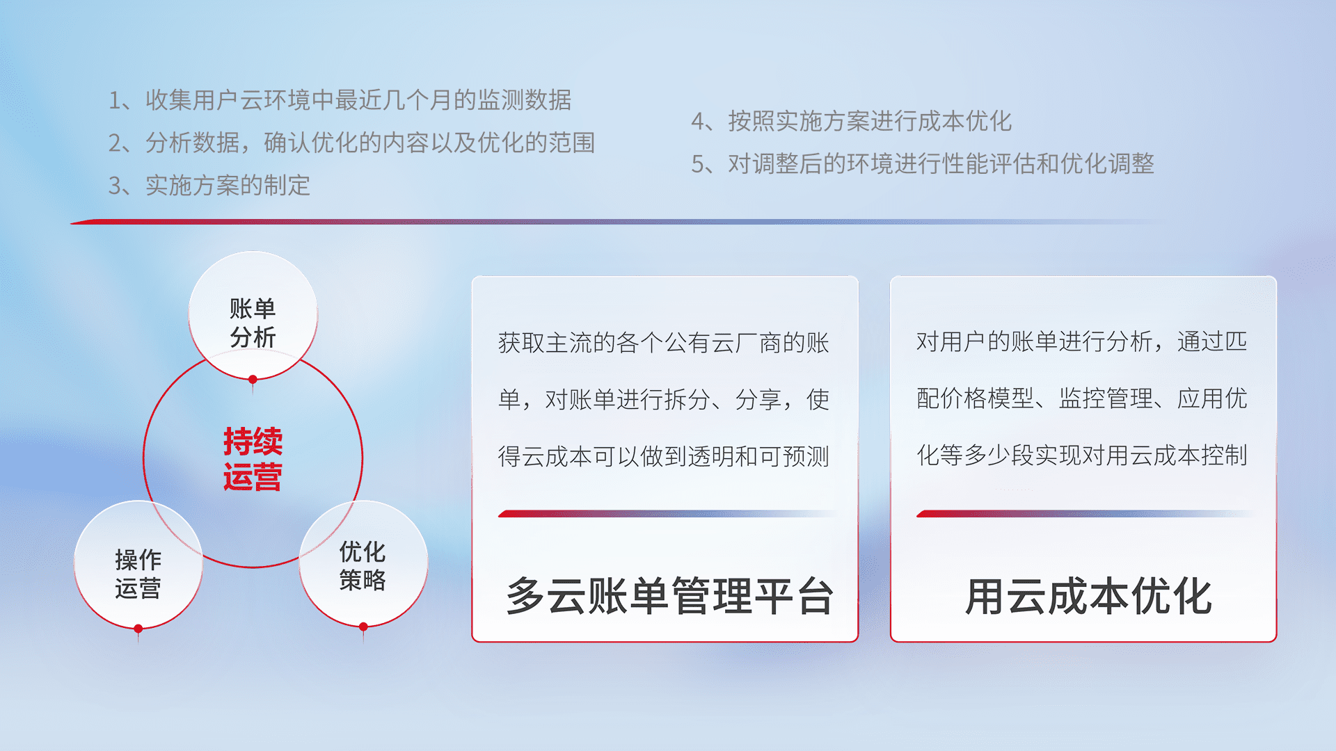 通过多云纳管,,以统一的资源数据模型把客户的云资源进行抽象和封装,,,进而实现对多云资源的统一操作,,,,保障云资源管理的可靠性、、稳定性与可用性。。量身定制化运维内容,,,,配置、、、、开发运维、、、、补丁管理、、、、备份、、、监控、、认证和访问管理、、、、审计和日常巡检等,,保障在用云过程中的可靠度,,,,稳定度以及高可用率。。