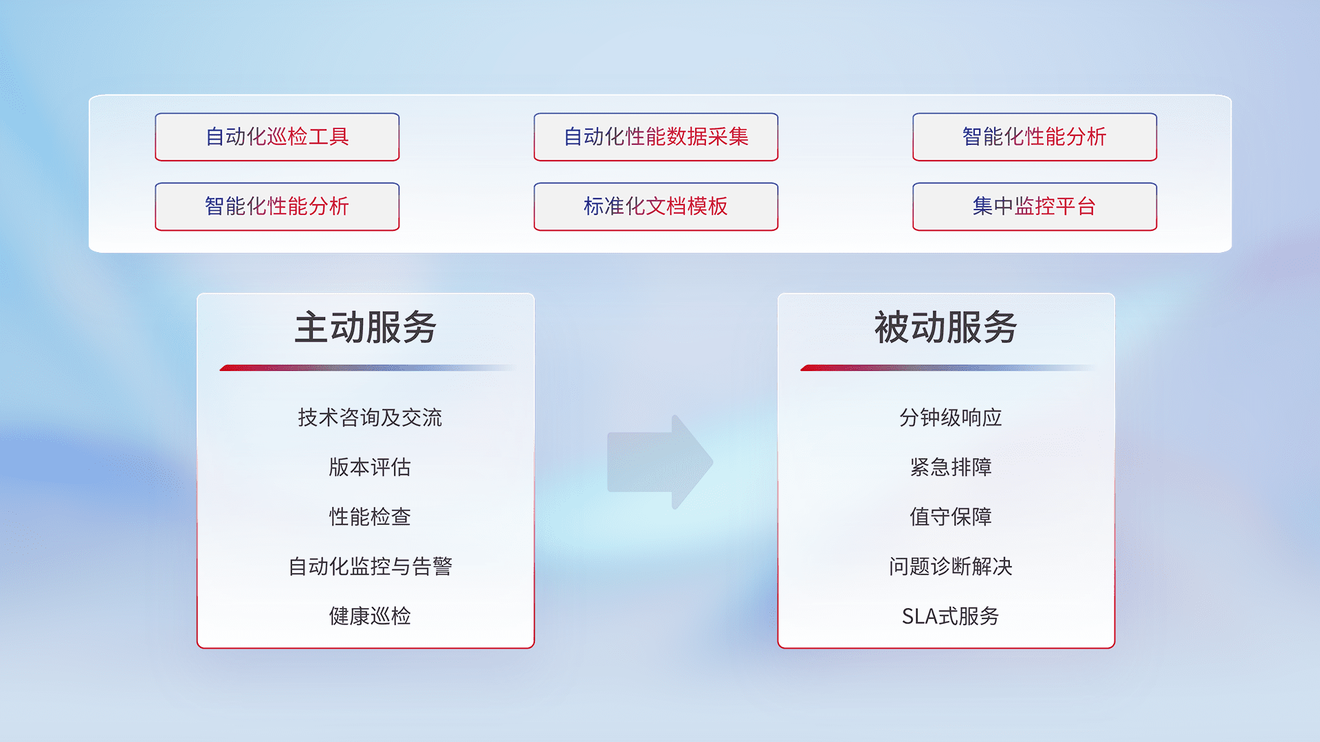 智能化工具和标准化文档,,,保障服务质量,,,,提供主动服务(包含技术咨询、、版本评估、、性能检查、、、自动化监控与告警、、、、健康巡检)和被动服务包含(分钟级响应、、紧急排障、、、值守保障、、、、问题诊断解决、、、SLA服务)。。